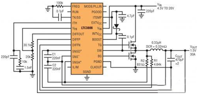 圖 2 顯示了一款以非常低的 DCR 完成采樣的高效率、1.5V/30A 降壓型轉換器。在這個設計中采用了一個 DCR = 0.32m? 的電感器,以最大限度地提高效率。