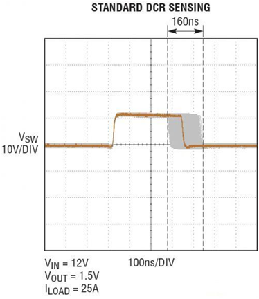 獨特的設計提高了效率以及噪聲靈敏度。在采用非常低的 0.32m? 電感器 DCR 時,最差情況的開關節點抖動減輕了 60%,如圖 5 所示。