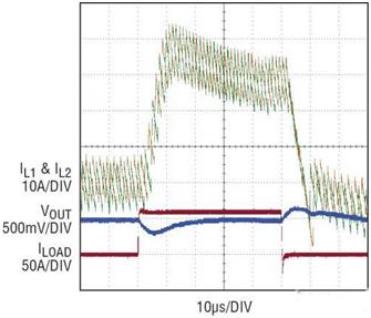 LTC3866 可以與一個電源構件一起使用,以實現更緊湊的設計和非常大的電流。圖 7 顯示了一款由兩個并聯的 LTC3866 + 電源構件電路組成的兩相、高效率、1.5V/80A 電源。盡管該電源構件中電感器的 DCR 僅為 0.53m?,但是在 DC 和瞬態情況下的均流性能是十分出色的 (如圖 8 所示)。