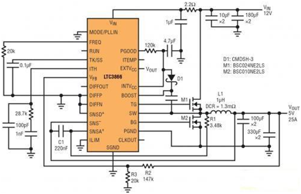 LTC3866 就解決了這個問題,使用該器件可以建立可靠和電流采樣電阻 <0.5m? 的電流模式開關電源。這款單相同步降壓型控制器用內置柵極驅動器驅動所有 N 溝道電源 MOSFET 開關。該器件采用一種獨特的架構,可提高電流采樣信號的信噪比,從而允許使用 DC 電阻 (DCR) 非常低的功率電感器或電阻值非常低的電流采樣電阻器,以最大限度地提高大電流應用的效率。這種特性可降低在 DCR 很低的應用中常見的開關抖動。