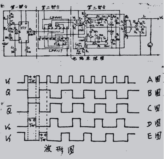 第二部分:這部分是由JK觸發(fā)器CD4027(只用一個y和四個輸入或非門CD4001(只用2個)組成。這部分電路完成脈沖信號的邏輯關(guān)系。V作為K觸發(fā)器的時鐘信號。每當時鐘信號的下降沿到來時,JK觸發(fā)器的Q端和Q端電平都將發(fā)生反轉(zhuǎn),如圖B和圖C。因為或非門的2角和5角信號為V,1角信號為Q.6角信號為Q,咱們曉得或非門只要輸人端一起為低電平常.輸出才為高電平。所以3角輸出波形V如圖D.4角輸出波形V,如圖E,它們的脈沖寬度為Tw。